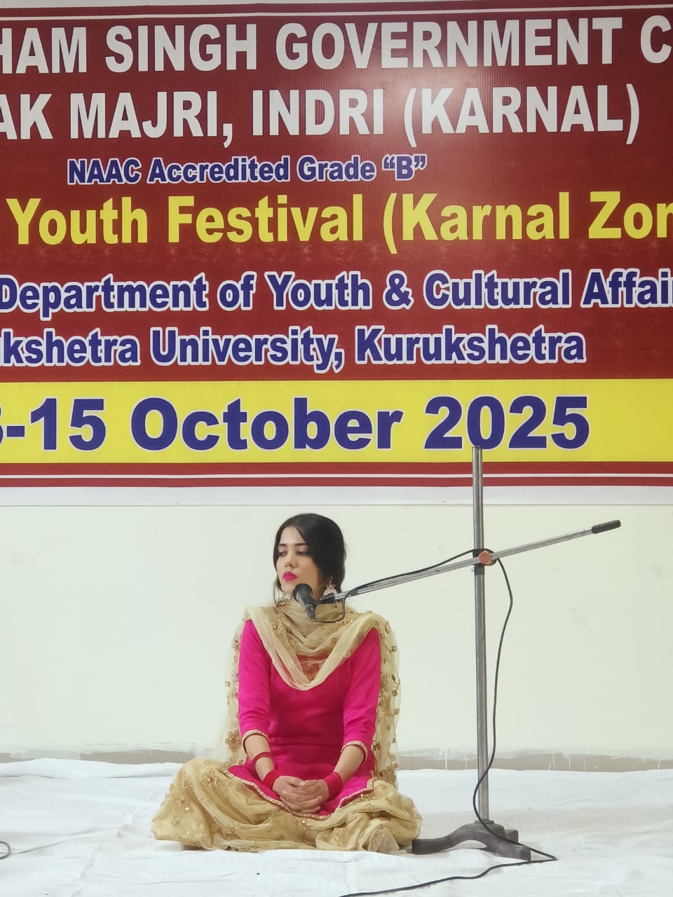 Group song Haryanvi 3rd position in Zonal Youth fest at S U S G C Matak Majri ,Indri Held on 13/10/25 to 15/10/25.